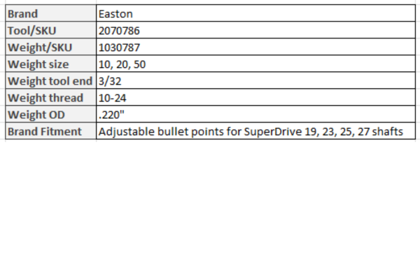 - Compatible with Easton Adjustable Bullet Points for the SuperDrive 19, 23, 25, and 27 arrow shafts