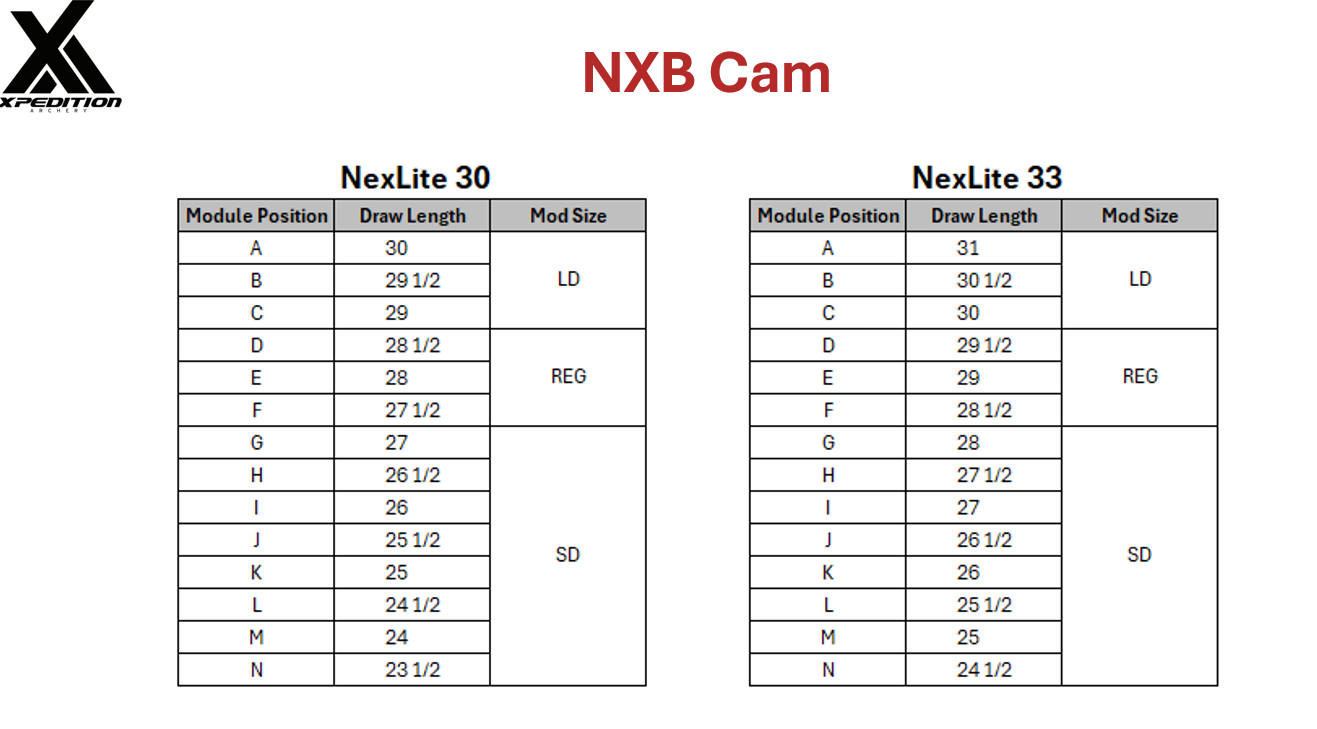 - NXB Cam System: NexLite™ features the NXB cam system. This Cam system was designed to have a smooth draw curve, making it very easy to pull, but specifically engineered for efficiency. The speeds that are produced by the system, while being easy to draw, are exceptionally fast. It has three module sizes to optimize performance at all draw lengths.